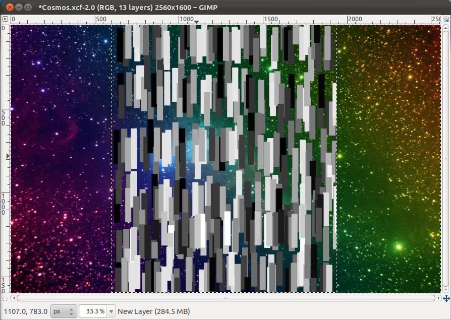 Download this brush and put the .gbr file in ~/.gimp-2.6/brushes Save the file as .xcf and than exit GIMP. Now open the .xcf file. Create a new layer and using the "Rectangle select" tool make a selection that is as high as the height of the and about 1/3 as wide. Now select the brush "rectangle long" in the "Paintbrush" tool and select the following settings for it: Size -> 0.50 , Brush Dynamic -> Random (just don't touch Hardness setting here) , Apply Jitter -> 1.0 , Use colour from gradient (standart).